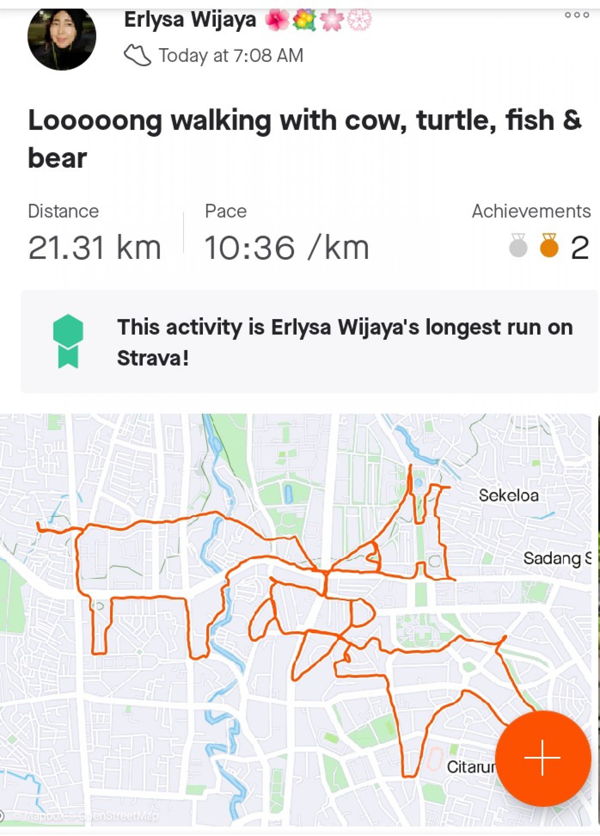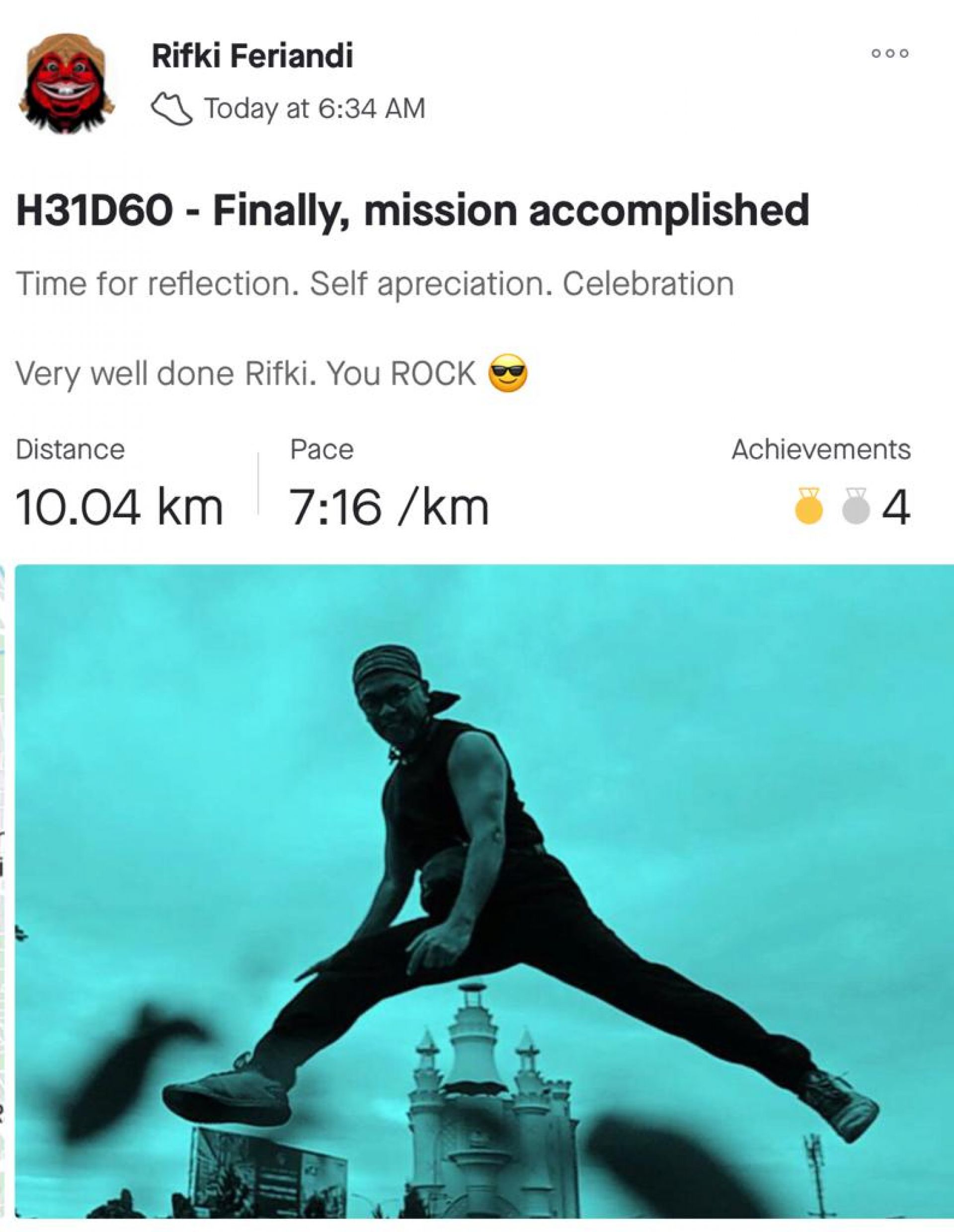 Dan ternyata itu yang terjadi. Saya memiliki habit baru. Berlari. Tidak tiap hari. Cukup tiga kali seminggu. Minimal tiga sampai lima kilometer. Saya juga kembali memiliki gairah atas tantangan. Sepuluh km bisa, kenapa tidak coba half marathon. Habit itu sangat terasa. Seperti ada yang hilang jika seminggu tidak berlari tuh. Kejar-kejaran di leaderboard Strava menjadi seru-seruan. Tapi yang paling terasa: badan bugar.